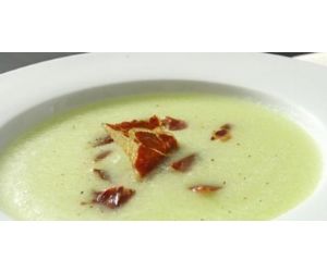 Se cortan los puerros, se lavan y se retira la parte verde, la cual se utilizará para hacer el caldo de pollo. Se corta en rodajas la parte blanca de los puerros, se fríe junto a la cebolla picada en juliana, en una sartén con aceite. Ponemos la parte verde de los puerros junto con 2 carcasas de pollo a cocer en agua, aunque podemos también usar un caldo comercial si no tenemos mucho tiempo. Mientras se va haciendo el caldo, se pelan las patatas, se trocean y se añaden a la sartén donde se están pochando los puerros, y se rehogan junto a ellos brevemente, sin que tomen color. A continuación se va añadiendo unos cacitos del caldo de pollo, dejando que todo se vaya ablandando a fuego lento. Una vez las patatas se pueden deshacer tras haber cocido unos 15 minutos, se añade la nata, y se mezcla bien. Se deja cocer unos diez minutos más y luego se tritura con la batidora. Si se prefiere menos espesa, se añade un poco más de caldo de pollo y por último, se deja enfriar. A continuación se prepara una compota, dejando cocer durante 20 minutos las manzanas reineta troceadas, con el azúcar y el agua. Se tritura y se reserva. Para hacer los crujientes de jamón, se parte cada loncha en dos mitades, y se van colocando en un plato con cuatro capas de papel de cocina por debajo de las lonchas y otras 4 por encima, para después cocerlas en el microondas a 900 w durante 3 minutos se deja enfriar y ¡ ya está todo listo para montar el plato!