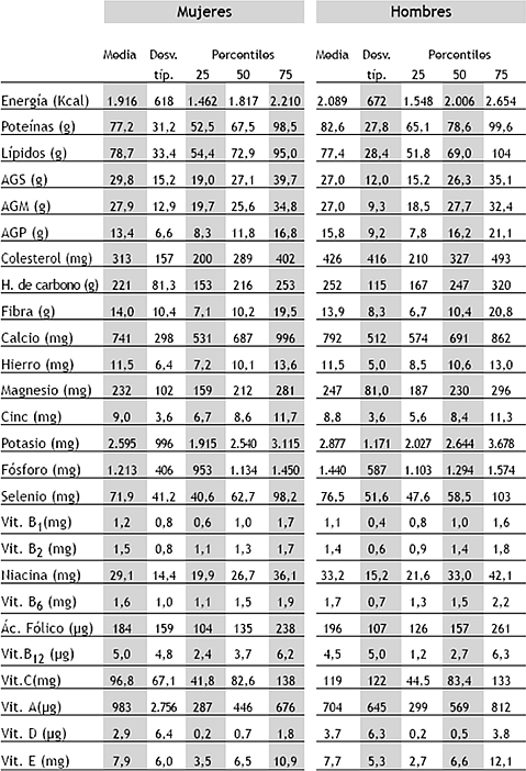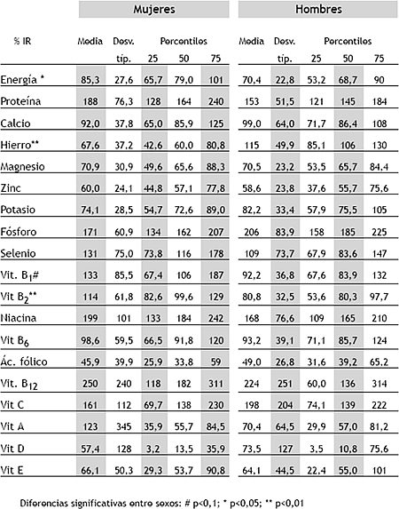 y en los hombres no alcanzaron este valor las ingestas de magnesio, zinc, ácido fólico, vitaminas B2, A y D. En las mujeres, la ingestas medias de