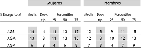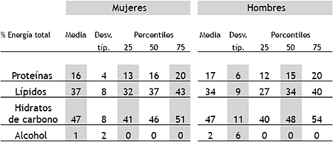 energía y nutrientes en mujeres y hombres (Tabla 3). El